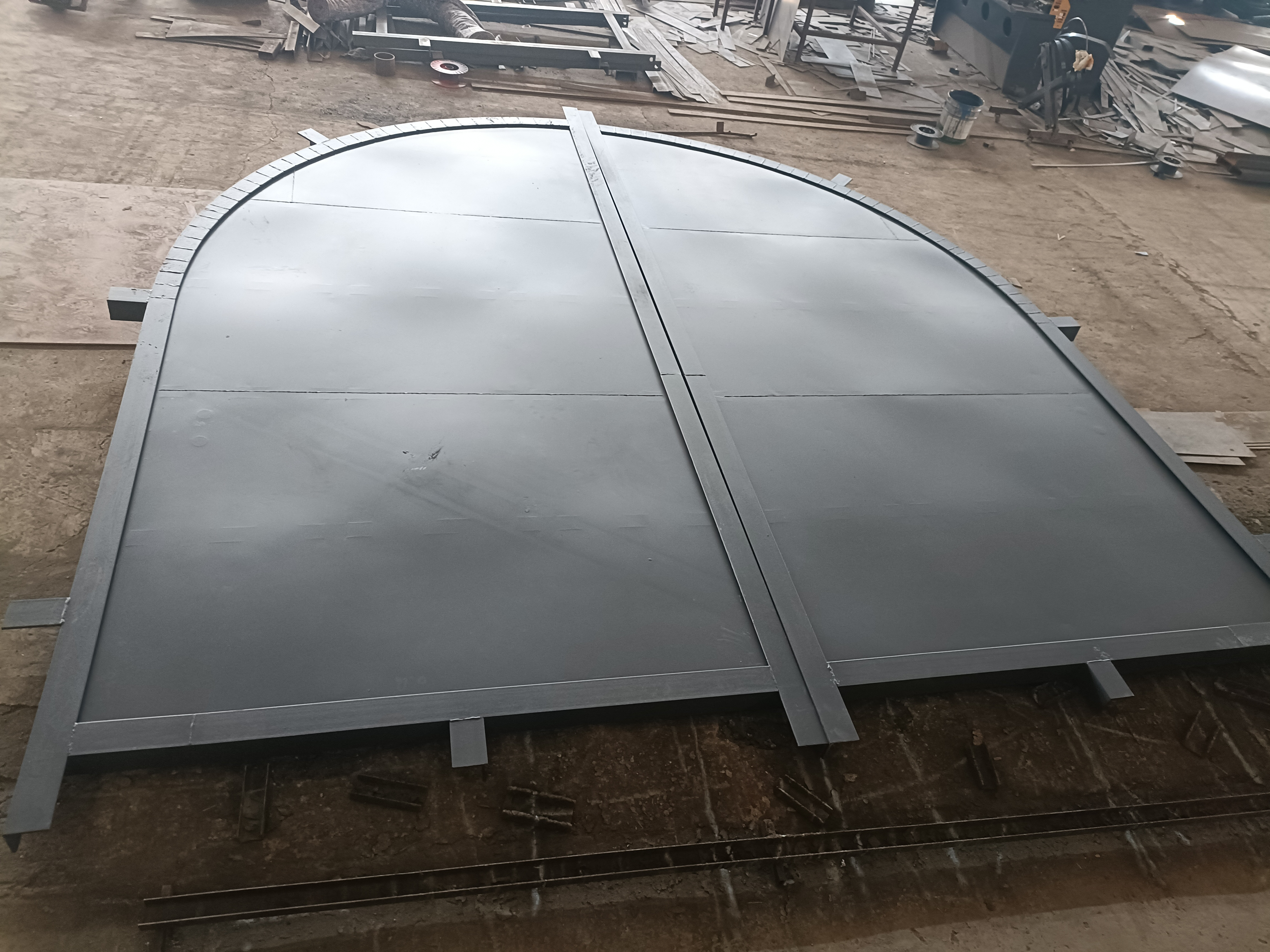 (2)将两扇门平放在地面,整理好两门中间的密封橡胶板,用螺栓将两门固定好,即待安装。